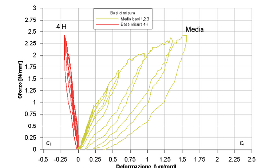Per quanto riguarda la prova con due martinetti piatti, il maggior impedimento si può presentare nel caso si studi il comportamento tenso-deformativo di edifici bassi (di 1 o 2 piani), per i quali non è garantito un sufficiente carico verticale al di sopra del punto di prova. In questi casi il livello di sforzo agente nelle murature è così basso che, durante lo svolgimento della prova, si formano delle fessure che partono dagli estremi dei tagli in cui sono inseriti i due martinetti piatti. A causa della carenza di contrasto sopra all’area di prova la distanza tra le basi di misura tende a crescere a causa dell’instaurarsi di sforzi di trazione e la pendenza della curva sforzo-deformazione è opposta a quella che si attende (Fig. 12). In tal caso la prova deve essere interrotta e la continuità della muratura deve essere ripristinata velocemente ristilando con malta il giunto tagliato.
